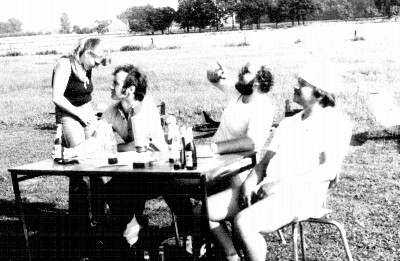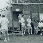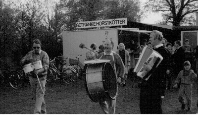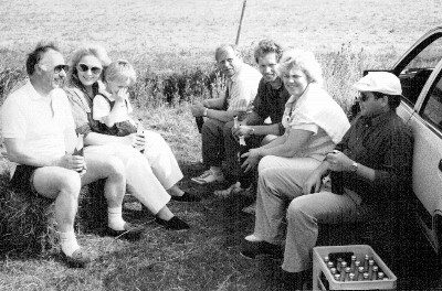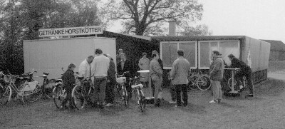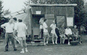 Unser jetziger Modellflugplatz musste erst hergestellt werden. Die Landebahn und die Zufahrt wurde von den Vereinsmitgliedern und mit Hilfe der Nachbarn erstellt. Viele Kubikmeter Sand und Split wurden in die Einfahrt gefahren, und mit viel Schweiß (und Bier) verteilt, planiert und befahrbar gemacht. In den folgenden Jahren wurde die erste Vereinshütte (eine alte Bauhütte gespendet von einem Gönner) aufgestellt. Sie wurde erweitert, verschönert und etliche Vereinsfeste wurden in ihr gefeiert. 1989 löste sich die Hütte in Qualm und Rauch auf. Die Übergangslösung sah so aus:
